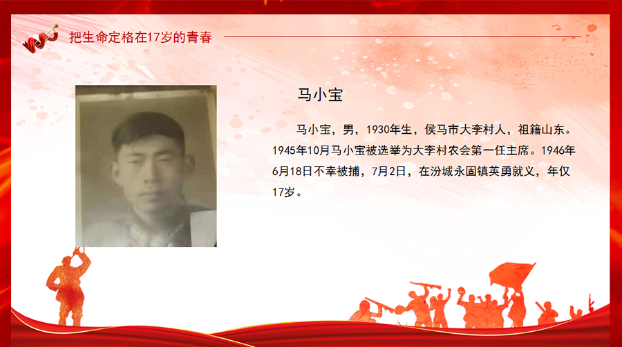 馬小寶,男,1930年生,侯馬市大李村人,祖籍山東。1945年10月馬小寶被選舉為大李村農(nóng)會(huì)第一任主席。1946年6月18日不幸被捕,7月2日,在汾城永固鎮(zhèn)英勇就義,年僅17歲。
