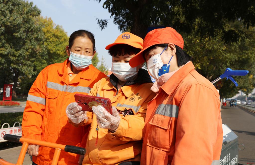 忻州街頭環(huán)衛(wèi)工人工作間隙收看大會。范濤 攝