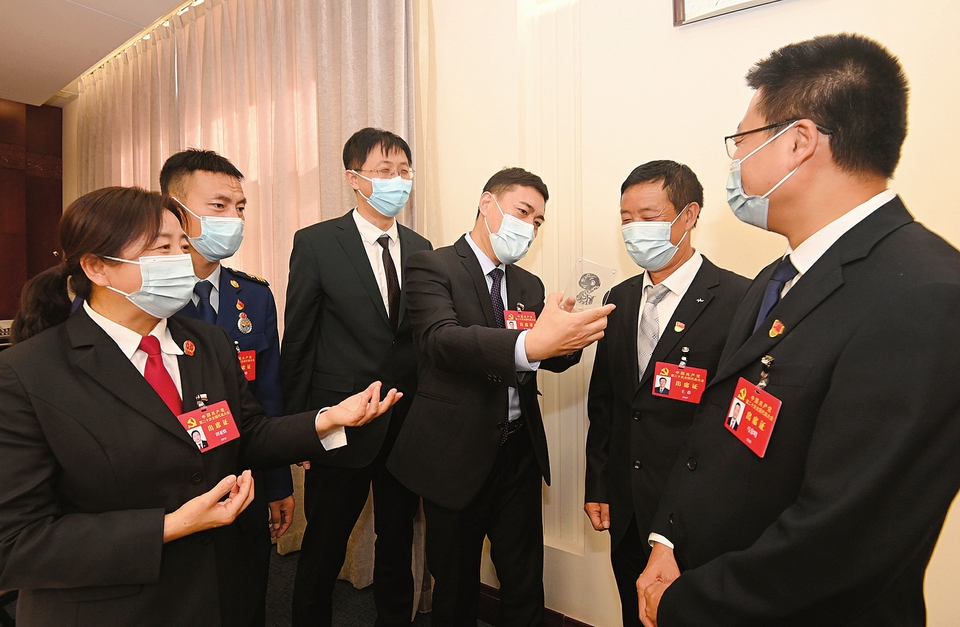 10月18日,出席黨的二十大的山西團代表田亞欣、張高峰、張靖、牛國棟、王春、馬黎明(自左至右)在會議間隙圍繞創(chuàng)新是第一動力話題展開討論。(記者李聯軍攝)