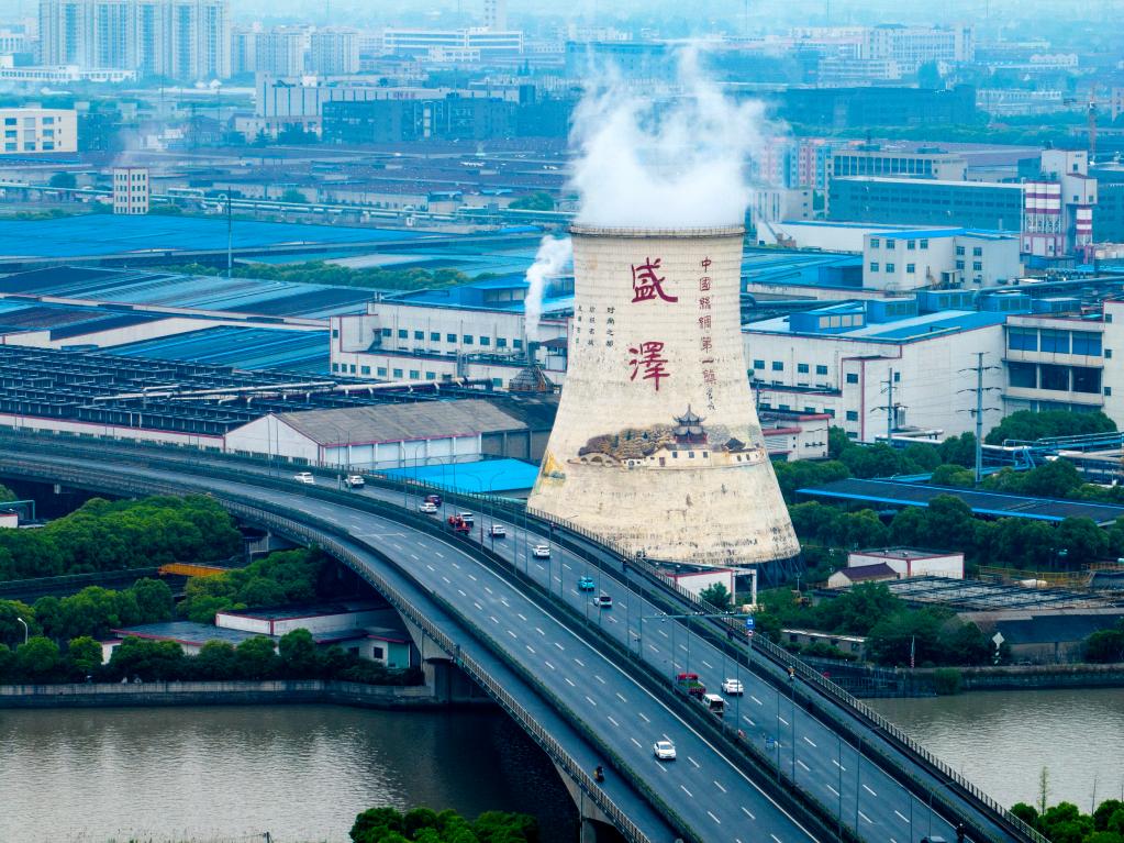 孟夏之月,萬(wàn)物并秀。位于江浙滬“金三角”環(huán)抱之中的江蘇省蘇州市吳江區(qū),一片生機(jī)盎然。驅(qū)車沿著盛澤鎮(zhèn)南三環(huán)高架橋自西向東行駛,一路上車流涌動(dòng),交通運(yùn)行繁忙。 “沒(méi)想到一個(gè)小鎮(zhèn)就有‘三環(huán)’,早晚高峰還堵車。喲!這里還是‘中國(guó)絲綢第一鎮(zhèn)’?!备S記者一路調(diào)研的司機(jī)師傅說(shuō)道。順著師傅的示意向窗外眺望,右前方高聳的白色冷卻塔,漸行漸近。塔上“盛澤”二字以及水鄉(xiāng)場(chǎng)景彩繪畫,讓這高55米、底部直徑約48米的冷卻塔,看起來(lái)像是一處“文化地標(biāo)”。