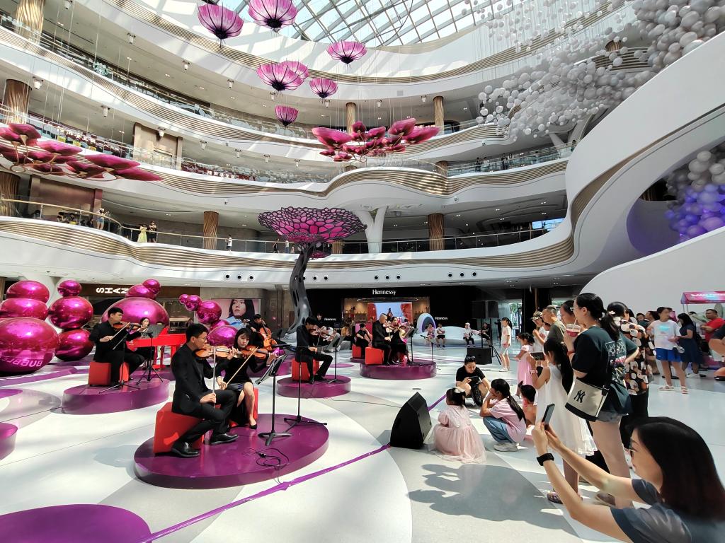 端午假期,??趪H免稅城內(nèi),伴隨著悠揚的音樂,陽光傾瀉“天際秘林”夢幻舞臺,正在購物的游客們紛紛駐足欣賞?!耙粓鍪覂?nèi)音樂會,給購物消費增添了新意和氛圍感?!焙?谑忻耜惱俪两陉柟夂鸵魳分?。