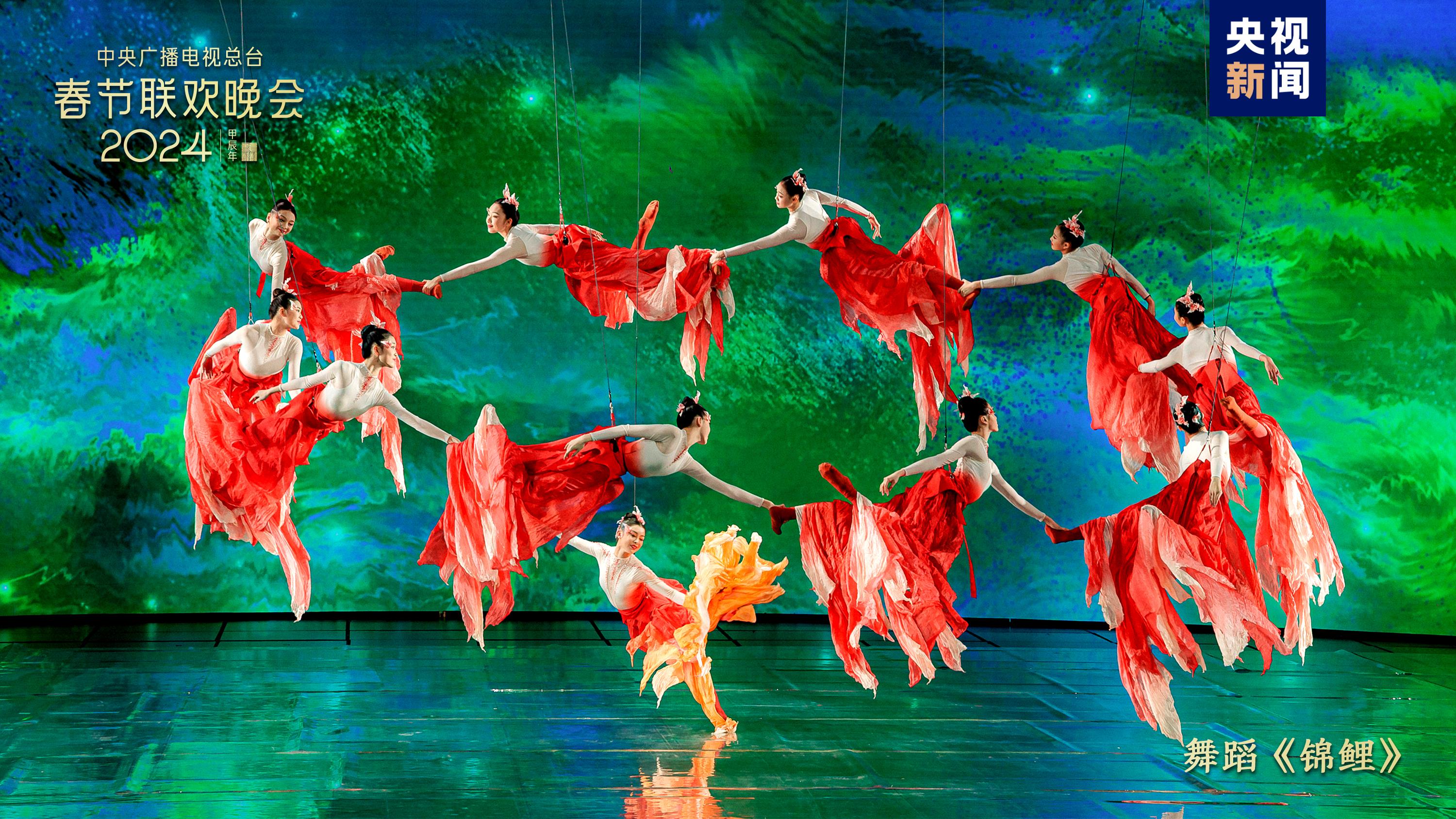 五彩紋樣燦若云霞,繪出錦繡中華。中國傳統(tǒng)紋樣創(chuàng)演秀《年錦》選取漢、唐、宋、明四個朝代富有代表性的紋樣,通過歌曲+虛擬合成技術(shù),織出一幅跨越千載的紋樣變遷圖卷。劉濤、劉詩詩、李沁、關(guān)曉彤身著傳統(tǒng)服飾,圖案繁盛、細(xì)節(jié)有序的華服之美隱藏著河清海晏、繁榮昌盛的美好祝福。舞蹈《錦鯉》融合AI、XR等技術(shù),舞者以飛天之姿化身水中錦鯉,點波流金,煥活舞臺上的一池春水,令人驚艷。