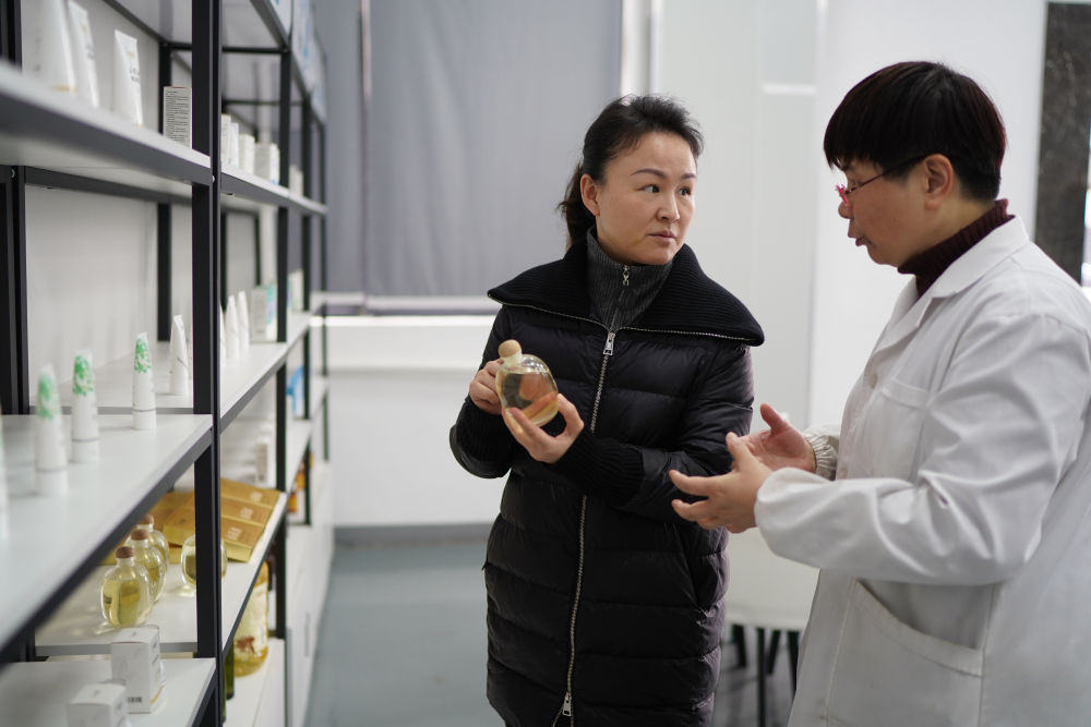 明經(jīng)華(左)在位于江西贛州市章貢區(qū)的贛州哈克生物科技有限公司調(diào)研油茶深加工產(chǎn)業(yè)(2023年2月24日攝)。新華社記者 周密 攝