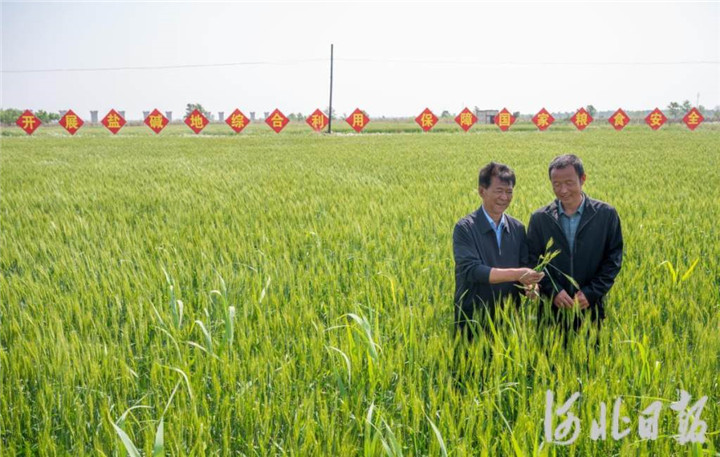 2023年5月,河北省滄州市黃驊市舊城鎮(zhèn)仙莊片區(qū)旱堿地麥田,后仙莊村村民楊東進(jìn)(右)和后仙莊村黨支部副書記劉玉鎖一起查看旱堿麥生長狀況。 河北日報(bào)記者 趙杰 攝
