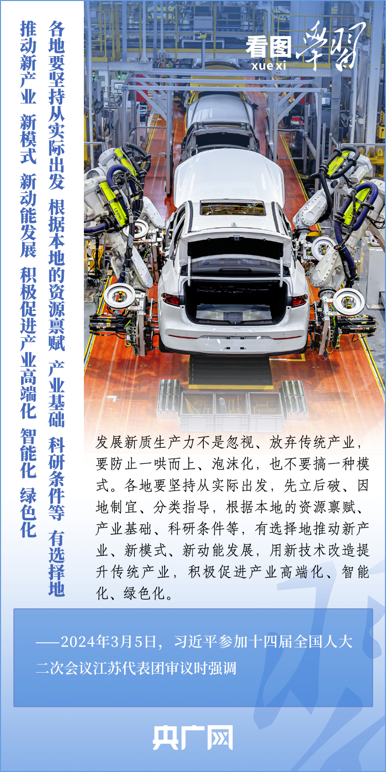 3月5日,十四屆全國人大二次會議正式開幕。5日下午,習近平總書記參加他所在的江蘇代表團審議時強調(diào),要牢牢把握高質量發(fā)展這個首要任務,因地制宜發(fā)展新質生產(chǎn)力。發(fā)展新質生產(chǎn)力不是忽視、放棄傳統(tǒng)產(chǎn)業(yè),要防止一哄而上、泡沫化,也不要搞一種模式。一起來學習!
