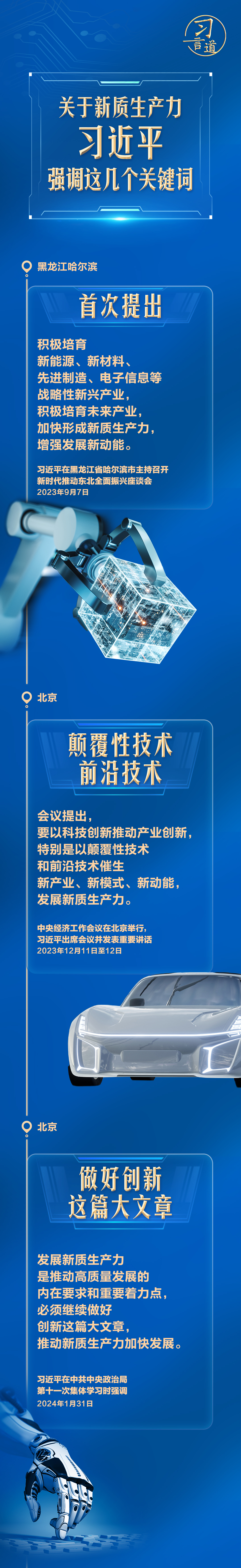 從去年9月在黑龍江考察時首次提出,到今年1月在中央政治局第十一次集體學(xué)習(xí)時系統(tǒng)闡述,再到此次兩會期間強調(diào),習(xí)近平多次談到新質(zhì)生產(chǎn)力。讓我們沿著總書記的足跡,一起研讀。