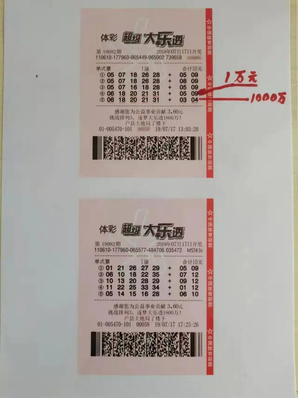 2019年7月17日,平時干送水工的姚先生閑來無事在朋友家下棋,下午5時許通過微信支付,在“好友”彩票店老板王先生處,以20元購買了兩張?bào)w彩大樂透彩票共10注號碼。王先生將兩張彩票拍照后,通過微信發(fā)給了姚先生確認(rèn)。