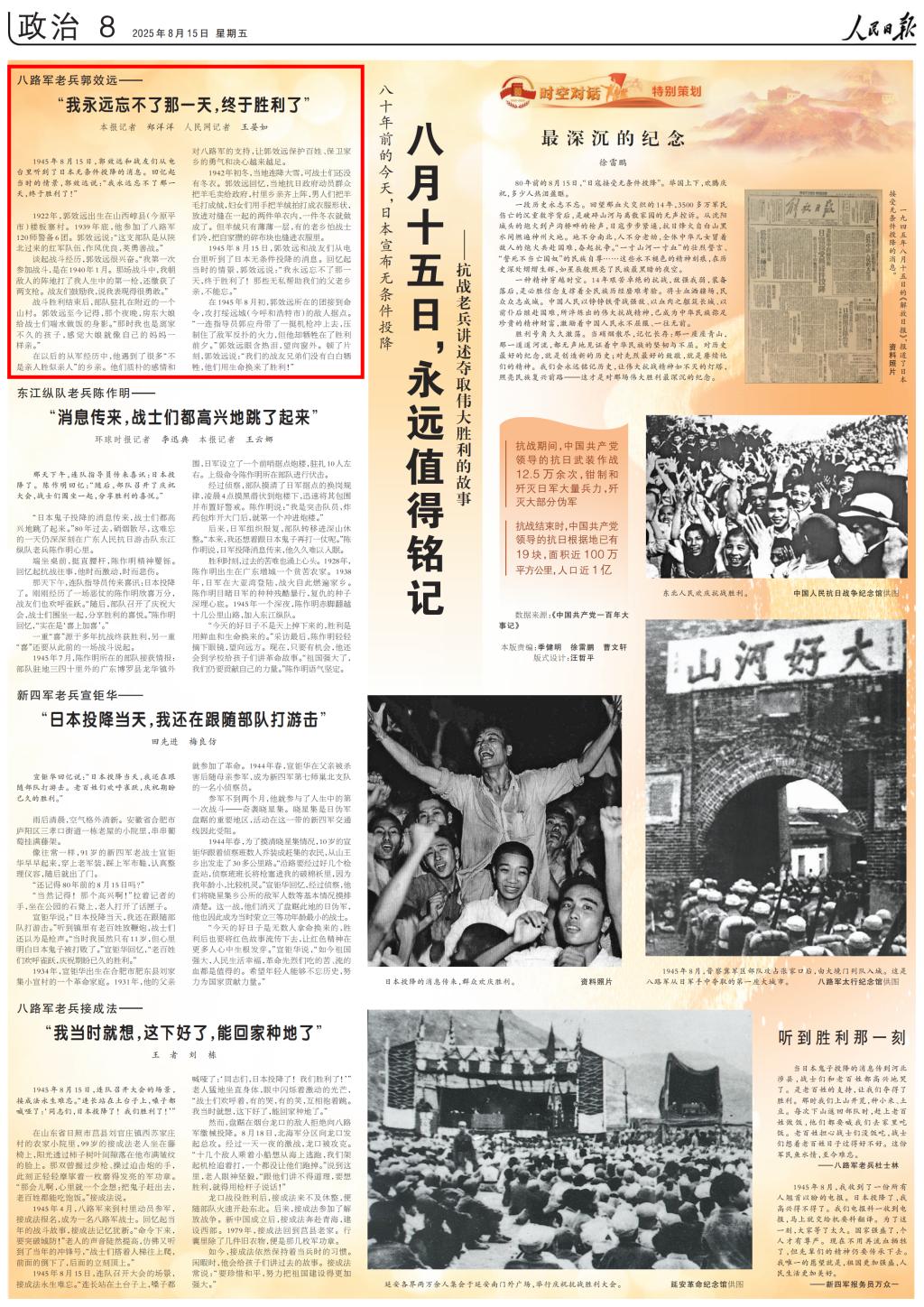 1945年8月15日,郭效遠(yuǎn)和戰(zhàn)友們從電臺里聽到了日本無條件投降的消息?;貞浧甬?dāng)時的情景,郭效遠(yuǎn)說:“我永遠(yuǎn)忘不了那一天,終于勝利了!那些無私幫助我們的父老鄉(xiāng)親,不能忘。”