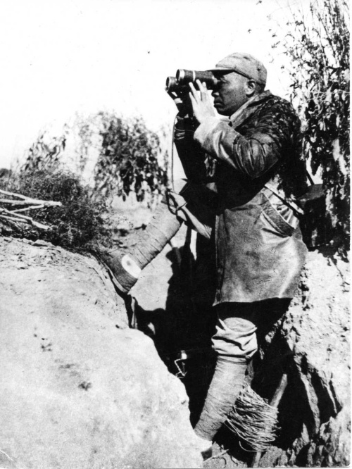 “誰敢橫刀立馬,唯我彭大將軍?!闭掌校淼聭汛蟀雮€(gè)身體露在戰(zhàn)壕外,左腳踏在戰(zhàn)壕底,右腳蹬著戰(zhàn)壕前沿,坐靠在戰(zhàn)壕后沿上,手持望遠(yuǎn)鏡,神情專注地觀察戰(zhàn)況。